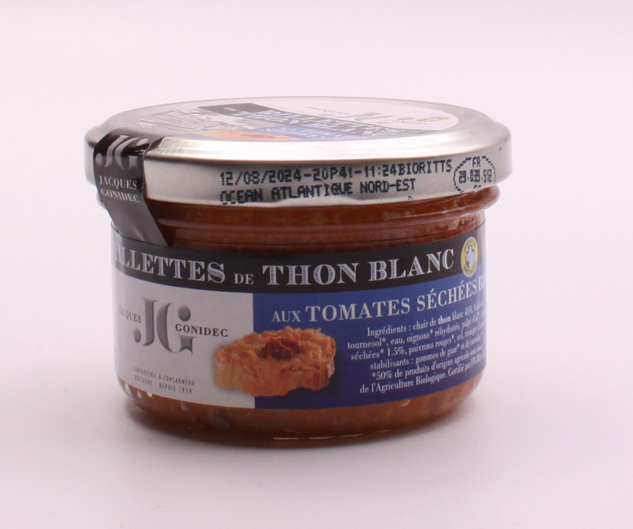 Ingrédients : chair de thon blanc 45%, huile de tournesol, eau, oignons réhydratés, pulpe d’ail, tomates séchées 1.5%, poivrons rouges, sel, vinaigre d’alcool, stabilisants : farine de guar et graines de caroube
